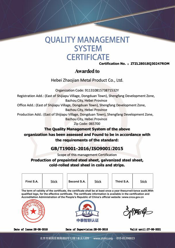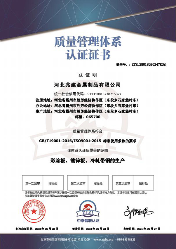 近日,中泰智聯認證有限公司對我公司進行了ISO9001:2015質量管理體系審核。經過審核組專家的全面、嚴格、細致的指導和審核,確認我公司質量管理體系符合ISO9001:2015質量體系標準的要求,最終順利通過ISO9001:2015質量管理體系的認證!