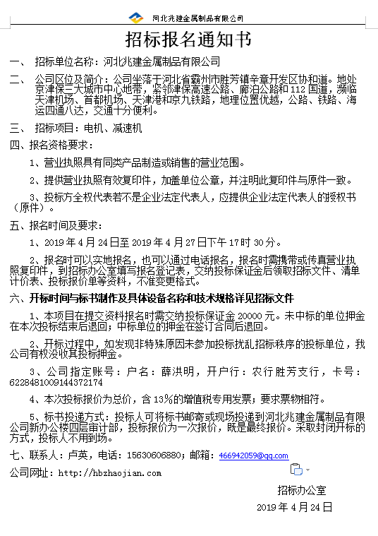 • 招標業主: 河北兆建金屬制品有限公司