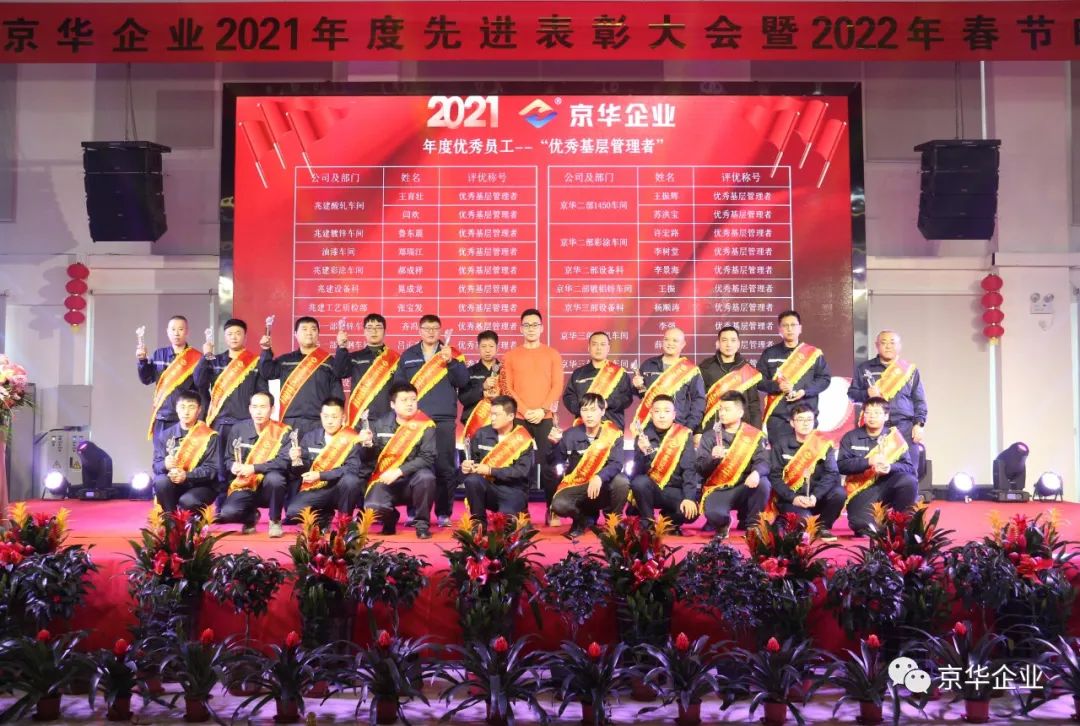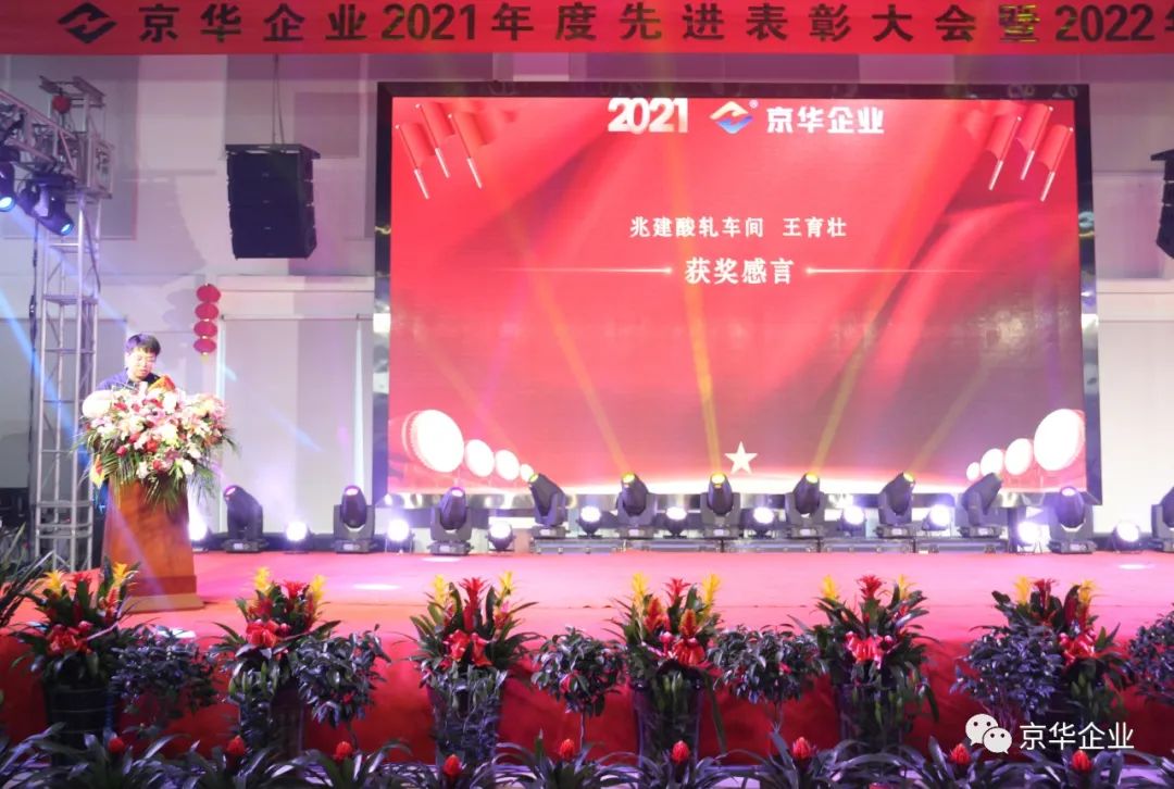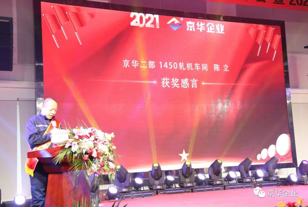 一分耕耘,一分收獲。2021年,一大批愛崗敬業、自強不息的京華企業優秀員工用實際行動為公司的發展貢獻了鮮活的力量,也為廣大公司員工樹立了學習的榜樣。本次表彰大會共產生年度優秀個人獎項90個、年度優秀車間團體獎項4個,獲獎員工及班組代表依次走上領獎臺接受公司領導的鼓勵與嘉獎,公司領導為每位獲獎員工頒發了榮譽證書及精美獎品并合影留念。最后由優秀員工代表京華二部1450軋機車間陳立及優秀管理者代表兆建酸軋車間王育壯發表了精彩、感人的獲獎感言,公司全體員工也為獲獎同事獻上了最真誠的祝福和最熱烈的掌聲。