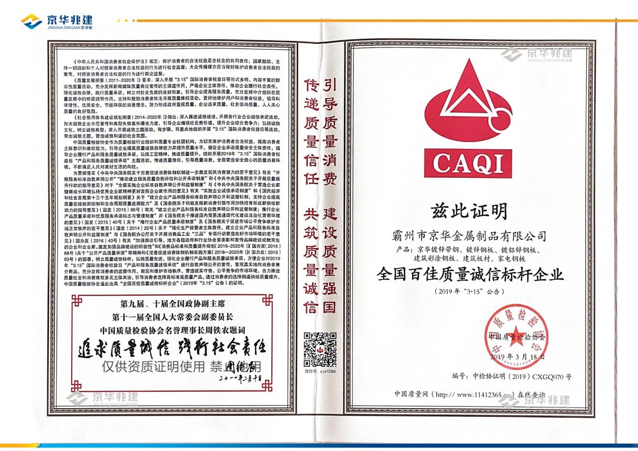 霸州京華金屬制品有限公司作為一家專業(yè)生產冷軋帶鋼、鍍鋅帶鋼、鋅鋁鎂帶鋼、冷軋鋼板、鍍鋁鋅鋼板、彩涂鋼板的現代化民營企業(yè),自創(chuàng)立以來,始終堅持創(chuàng)新,不斷擴大生產規(guī)模,通過了質量管理體系ISO9001認證、歐盟CE認證等多項權威認證,且榮獲了“全國百佳質量誠信標桿企業(yè)”、“中國建材企業(yè)50強”、“重合同守信用企業(yè)”等多項榮譽。